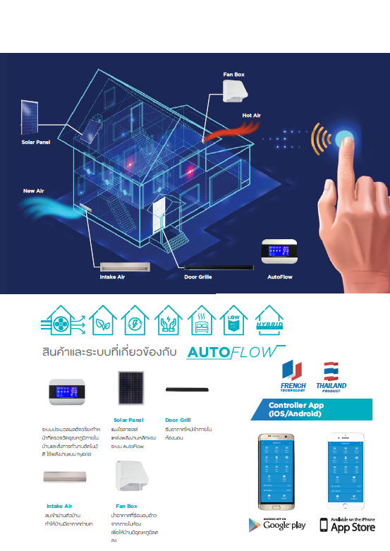 นวัตกรรมใหม่ของระบบถ่ายเทอากาศ ในระบบ Automation ผู้อยู่อาศัยสามารถตรวจสอบการทำงานของระบบจากมือถือได้ และระบบจะทำงานโดยอัตโนมัติสั่งการโดยใช้ Application ในมือถือ (Android และ IOS) สามารถเช็คสถานะระบบและการทำงานผ่านมือถือได้สั่งการโดยใช้ RF Remote Control สามารถเช็คสถานะระบบ และ การทำงานผ่านมือถือได้ หมุนเวียนและถ่ายเทอากาศ หมุนเวียนอากาศภายนอกเข้ามาทดแทนอากาศภายใน โดยทำหน้าที่นำอากาศเก่าที่อยู่ในบ้านออกไป ลดความร้อนของอุณหภูมิชั้นบนของบ้าน หรือ ห้องที่โดนแสงแดด หรือ ห้องที่ปิดมิดชิดไม่มีอากาศถ่ายเทลดการเสียหายของ Furniture เนื่องจากความร้อน และ อากาศที่ไม่ถ่ายเทลด VOC ลด Carbondioxide (PPM)